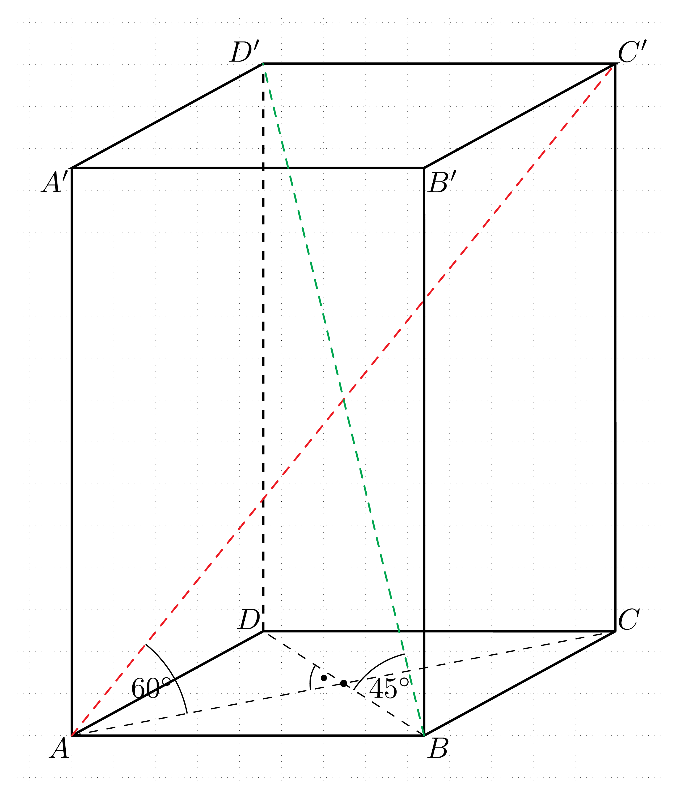 Przekątna ma długość i jest nachylona do płaszczyzny podstawy pod kątem , a przekątna jest nachylona do tej płaszczyzny pod kątem .