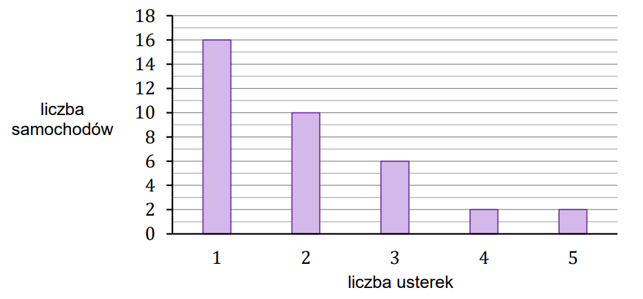 W stacji diagnostycznej odnotowywano liczby usterek wykrytych podczas przeglądów technicznych pięcioletnich samochodów w lipcu 2025 roku. Wszystkie odnotowane wyniki przedstawiono na poniższym diagramie. Na osi poziomej podano liczbę usterek, które zostały wykryte podczas przeglądów, a na osi pionowej podano liczbę samochodów, w których wykryto daną liczbę usterek.