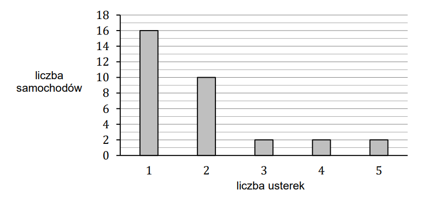 Na osi poziomej podano liczbę usterek, które zostały wykryte podczas przeglądów, a na osi pionowej podano liczbę samochodów, w których wykryto daną liczbę usterek.