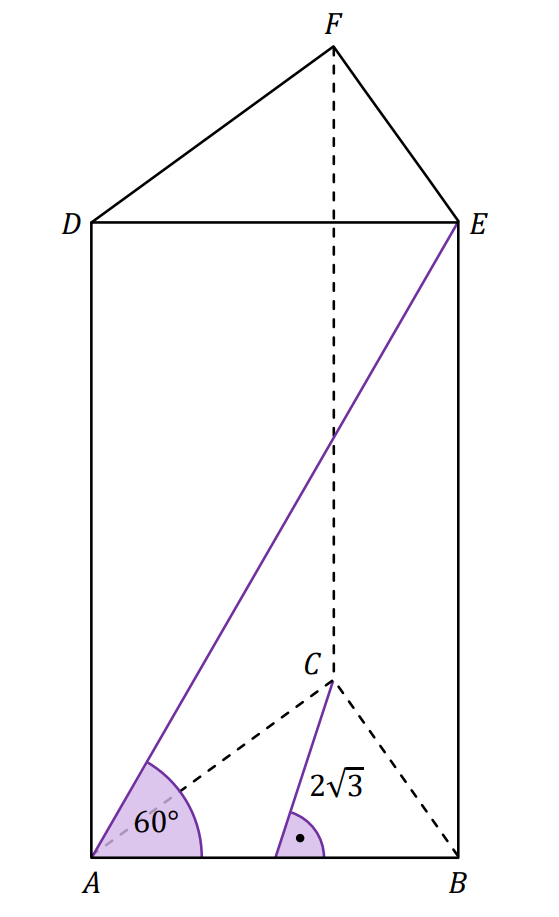Dany jest graniastosłup prawidłowy trójkątny. Wysokość podstawy jest równa . Przekątna ściany bocznej tworzy z krawędzią kąt o mierze (zobacz rysunek).