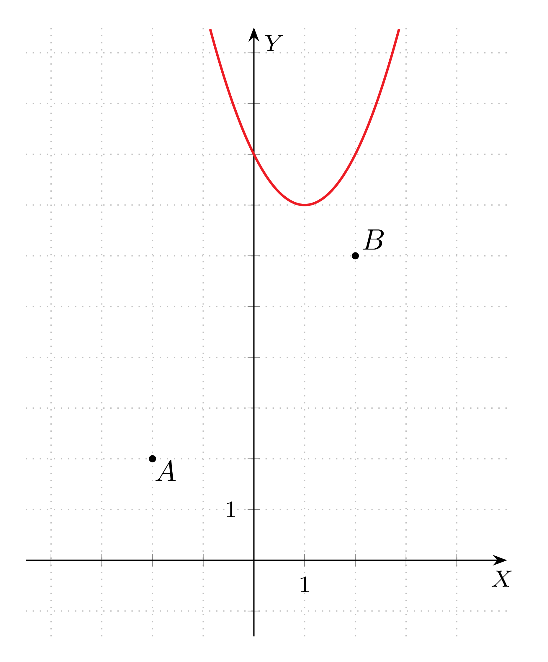 Dane są parabola o równaniu oraz punkty i (zobacz rysunek). Rozpatrujemy wszystkie trójkąty , których wierzchołek leży na tej paraboli. Niech oznacza pierwszą współrzędną punktu .