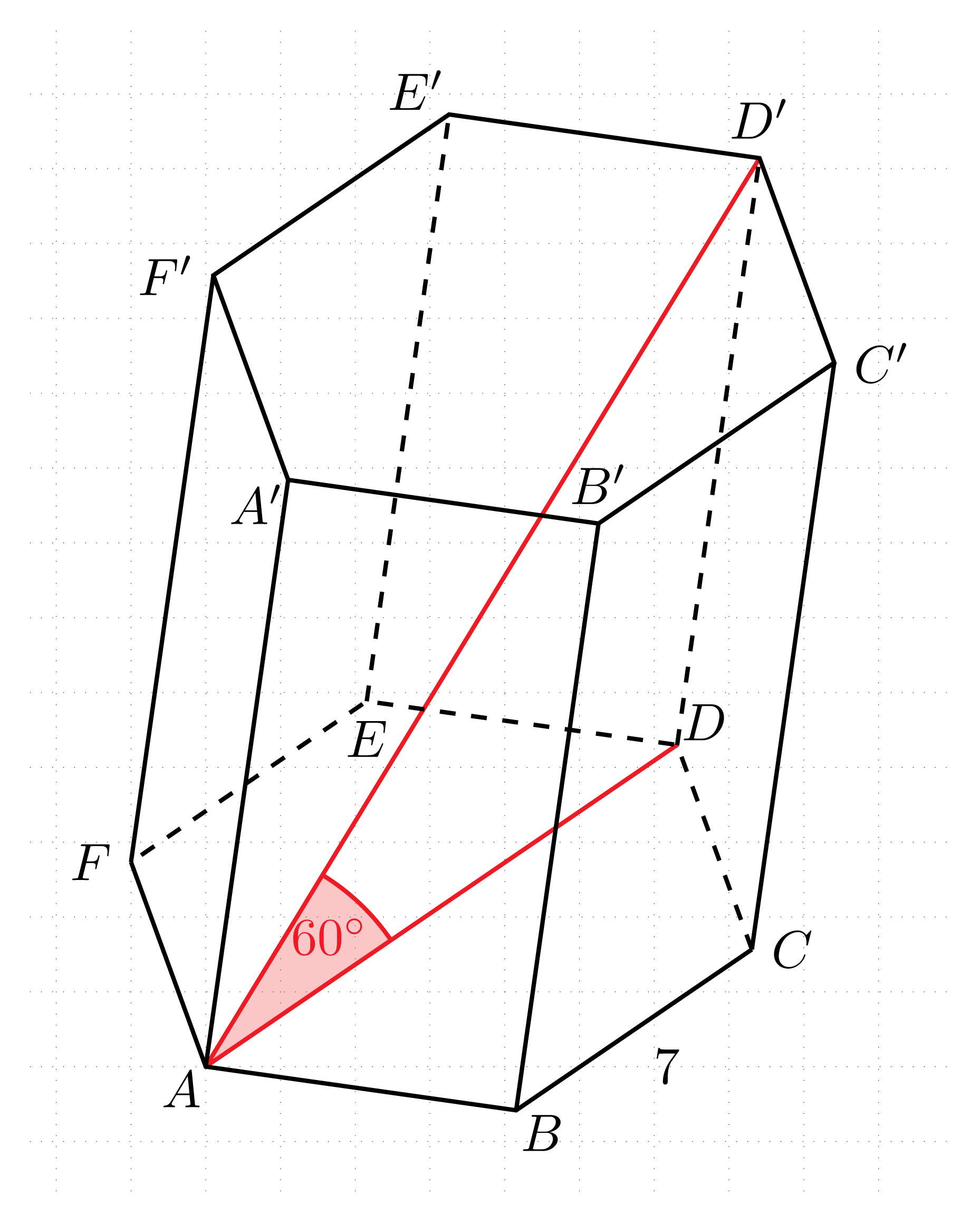 Dany jest graniastosłup prawidłowy sześciokątny 𝐴𝐵𝐶𝐷𝐸𝐹𝐴'𝐵'𝐶'𝐷'𝐸'𝐹', w którym krawędź podstawy ma długość . Przekątna tego graniastosłupa jest nachylona do płaszczyzny podstawy pod kątem (zobacz rysunek).