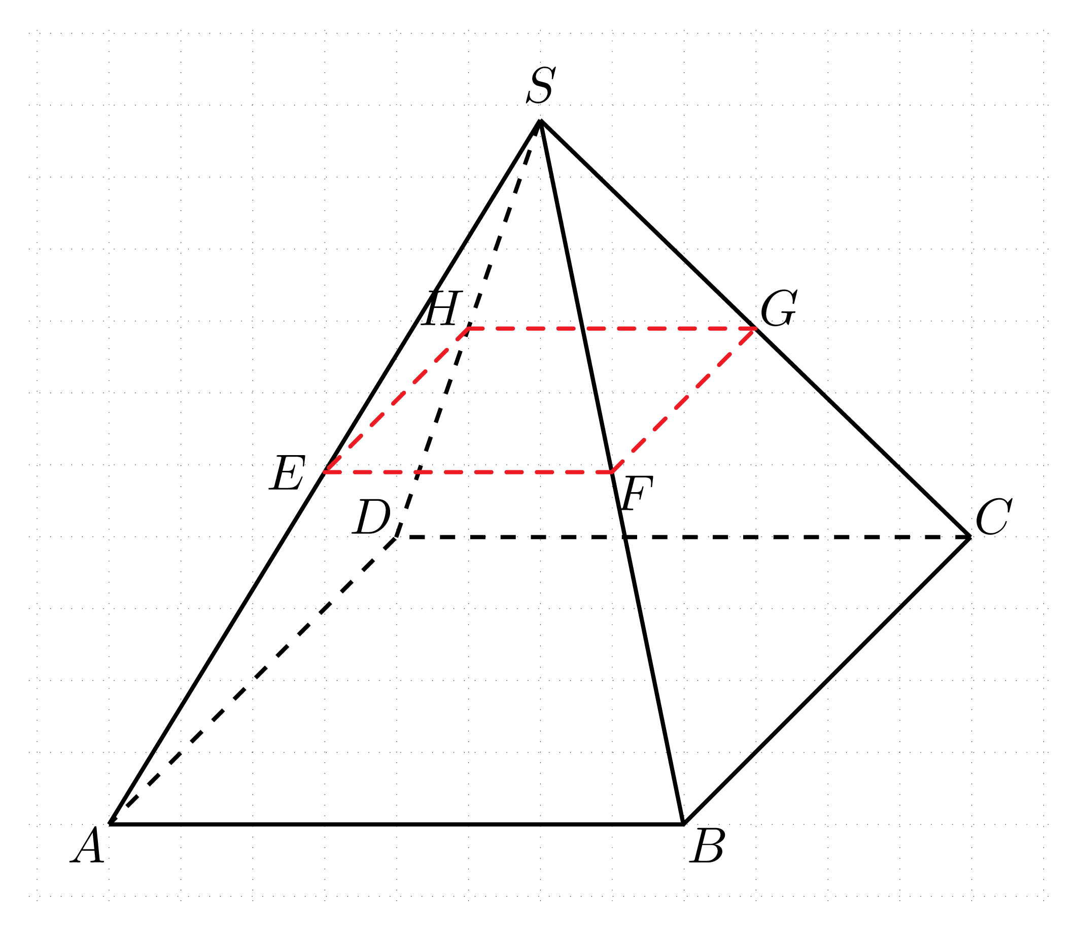 Dany jest ostrosłup prawidłowy czworokątny o podstawie . Punkty i są środkami – odpowiednio – krawędzi bocznych , , i (zobacz rysunek).