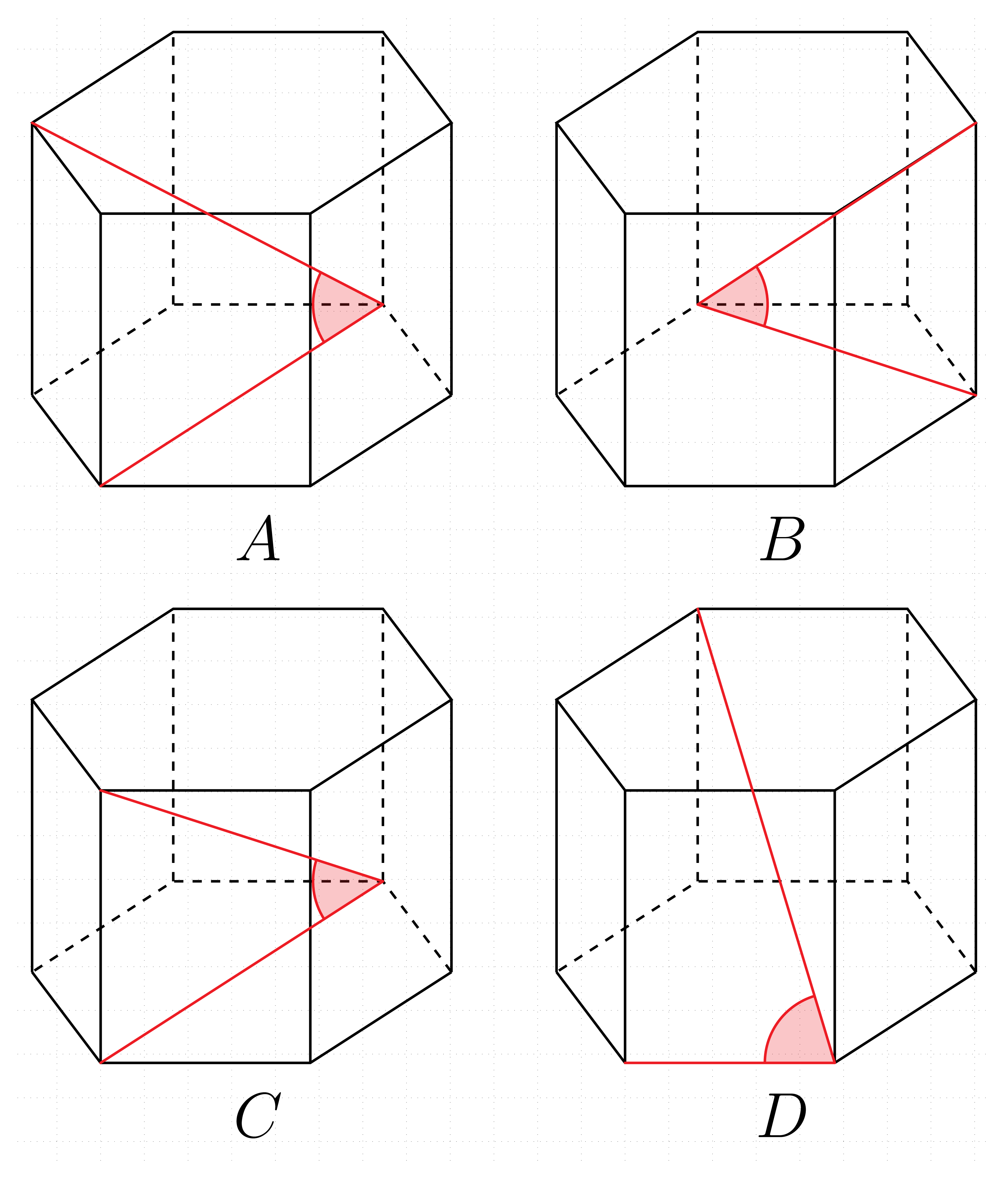 Kąt nachylenia najdłuższej przekątnej graniastosłupa prawidłowego sześciokątnego do płaszczyzny podstawy jest zaznaczony na rysunku