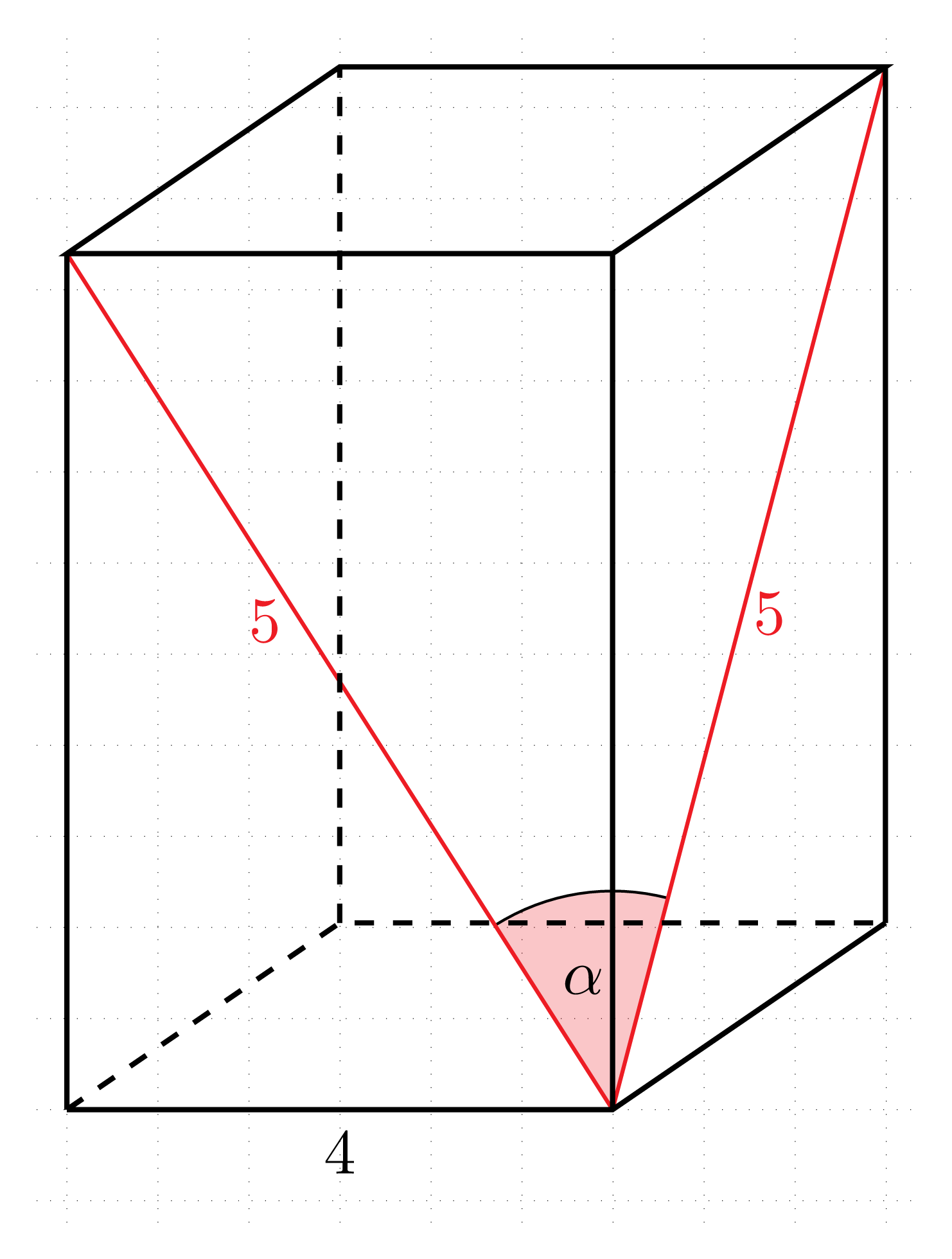 Podstawą graniastosłupa prawidłowego czworokątnego jest kwadrat o boku długości , a przekątna ściany bocznej ma długość (zobacz rysunek). Kąt, jaki tworzą przekątne ścian bocznych tego graniastosłupa wychodzące z jednego wierzchołka, ma miarę .