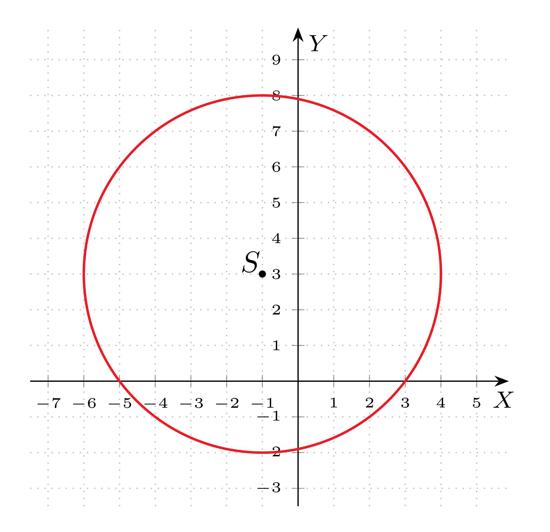 Punkt jest środkiem okręgu przedstawionego na rysunku. Równanie tego okręgu ma postać: