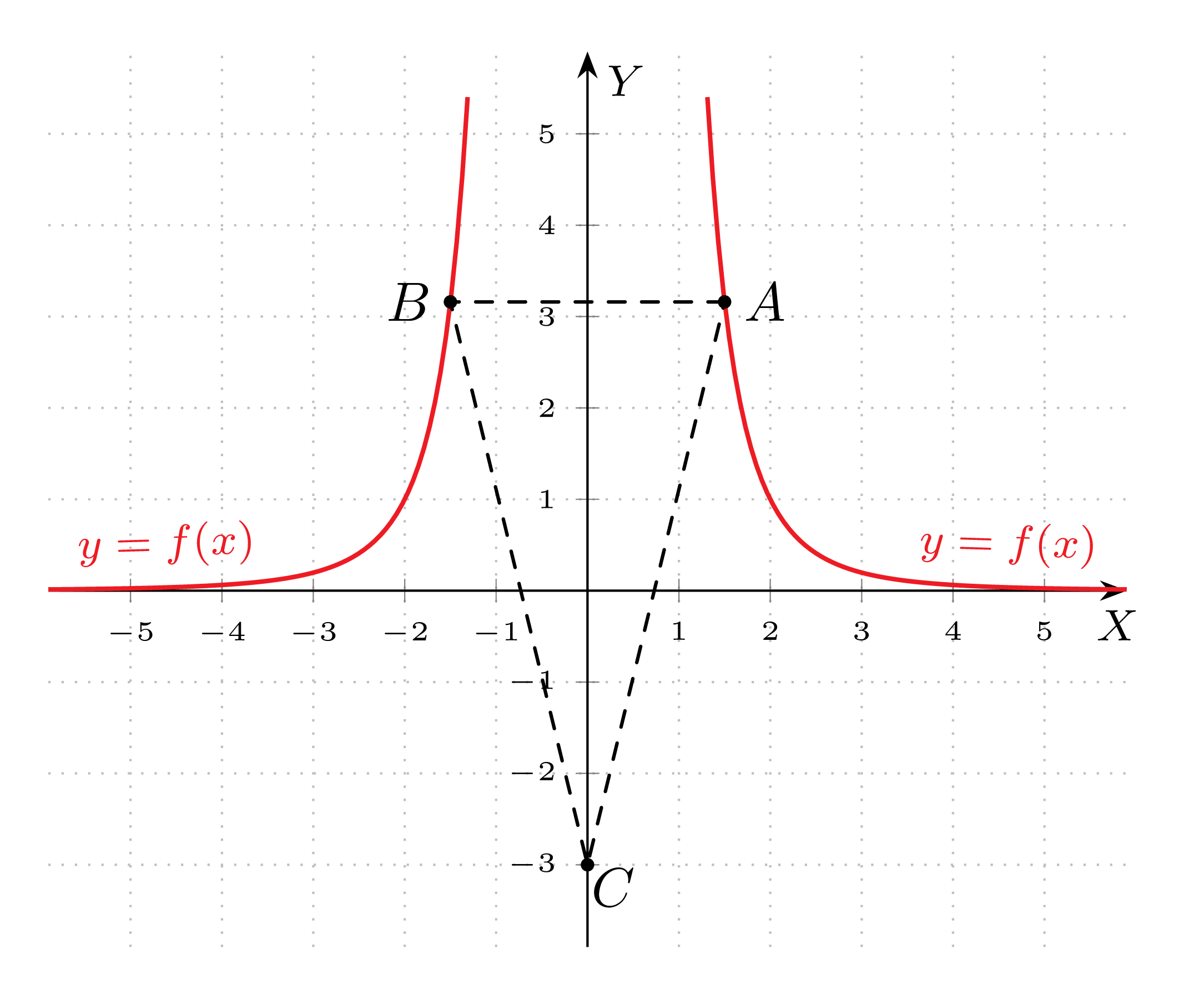 Rozpatrujemy wszystkie trójkąty , których wierzchołki i leżą na wykresie funkcji określonej wzorem dla . Punkt ma współrzędne , a punkty i są położone symetrycznie względem osi (zobacz rysunek). Oblicz współrzędne wierzchołków i , dla których pole trójkąta jest najmniejsze. Oblicz to najmniejsze pole.