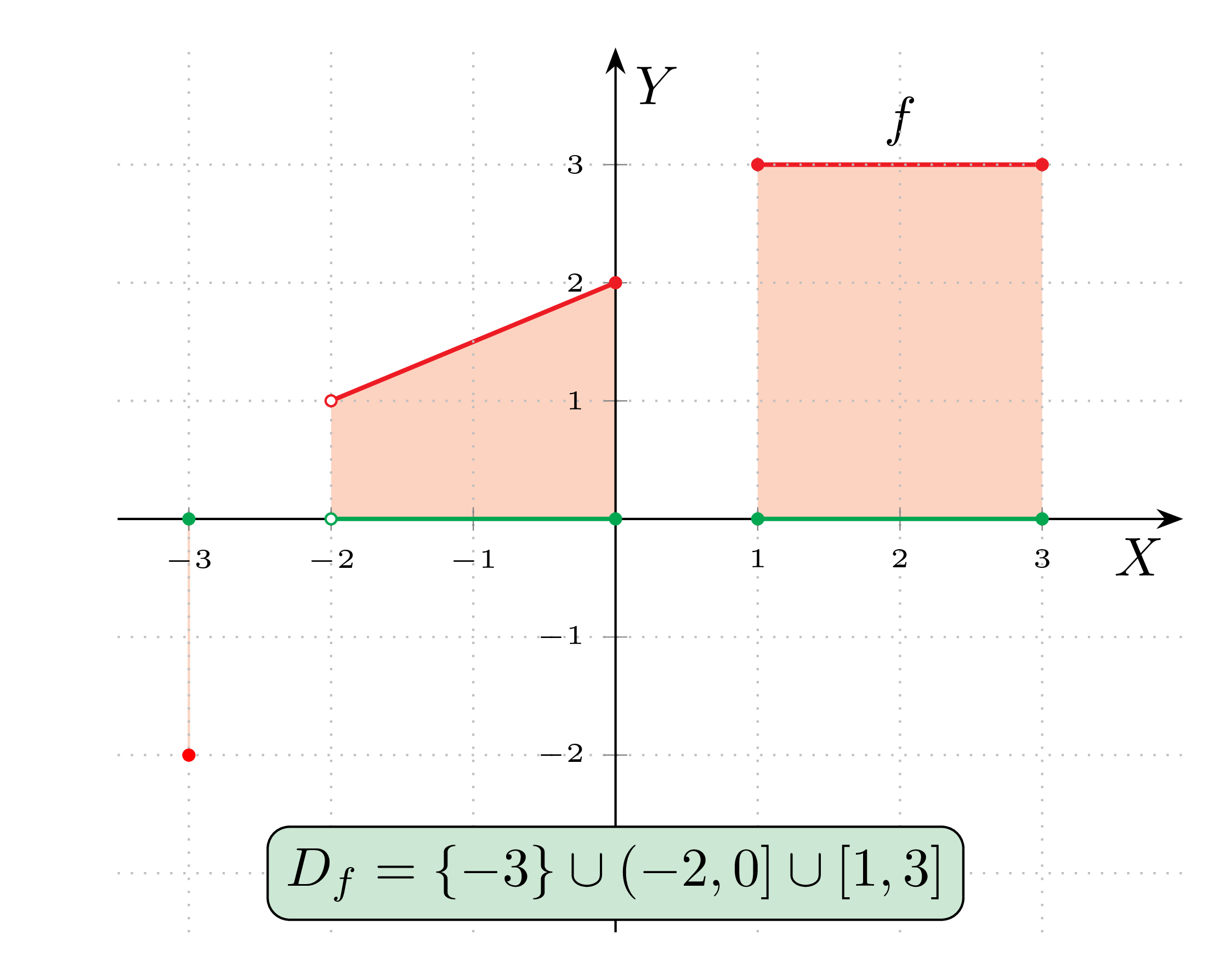 Gdy funkcja jest określona za pomocą wykresu, to jej dziedzinę określamy analizując zakres wartości argumentów x, dla których funkcja jest zdefiniowana. W praktyce: