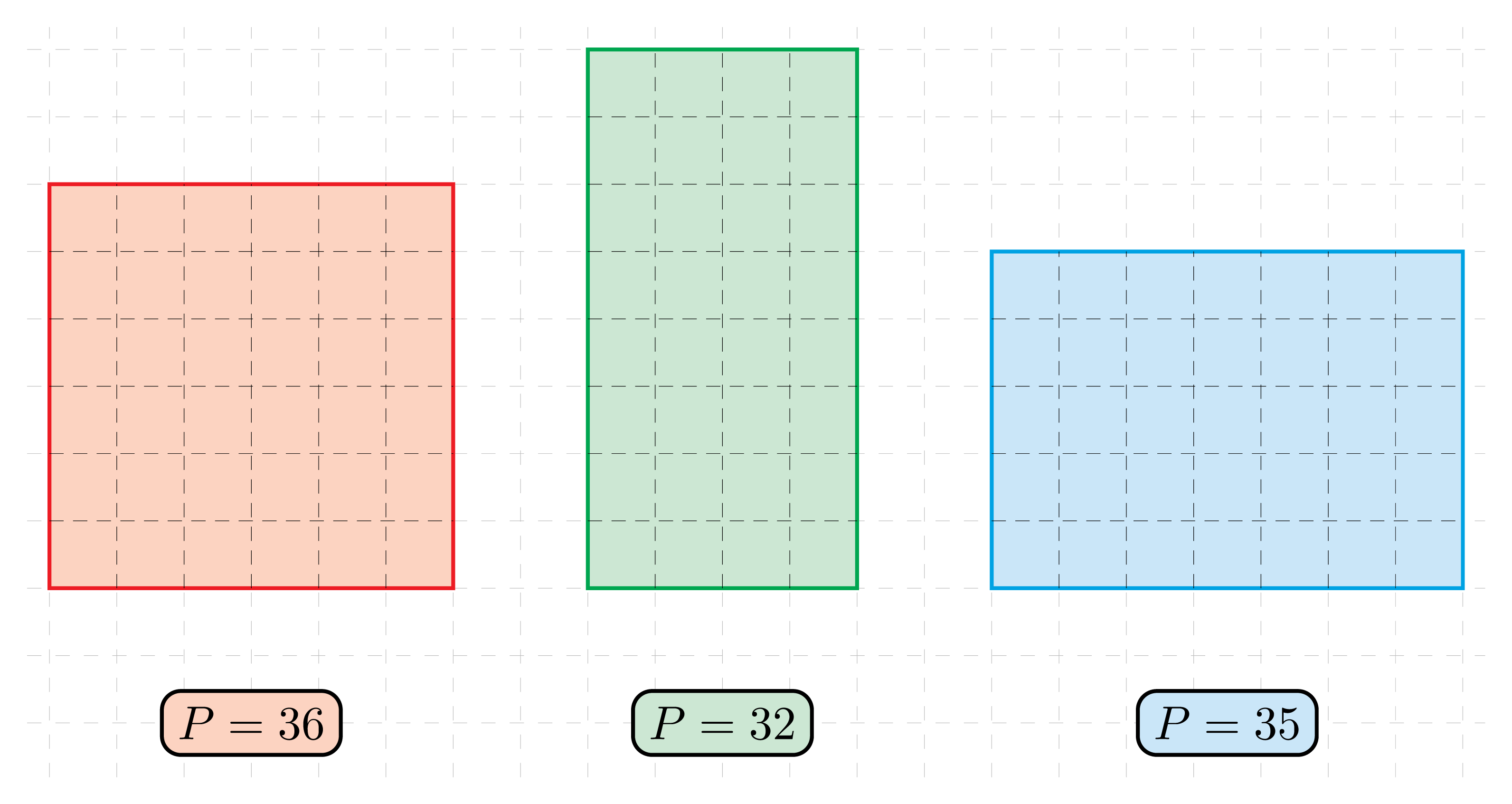 Poniższy rysunek przedstawia 3 figury geometryczne podzielone na mniejsze kwadraty o identycznych wymiarach. Na pierwszy rzut oka ciężko byłoby nam wskazać która figura ma największe pole. Jeśli jednak wyrazimy pola tych figur za pomocą tych mniejszych kwadratów, okaże się że to czerwona figura ma największe pole równe 36 jednostek, a zielona - najmniejsze równe 32 jednostki. Symbolicznie, pole powierzchni zapisujemy za pomocą symbolu P.
